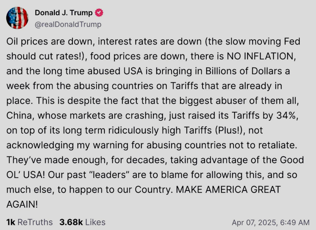 As I argued in S1E3, I don't believe this is mere incompetence, but rather a calculated move within a broader strategy to reshape the US, both domestically and internationally. The escalation with China, coupled with the market's, the Federal Reserve's, and some of his billionaire allies' reactions in the past 48 hours, just underline his appetite for risk. He has already begun to target the FED, laying the groundwork for a populist argument: Monetary policy for China or for American workers? when he shared on his Twitter copy: